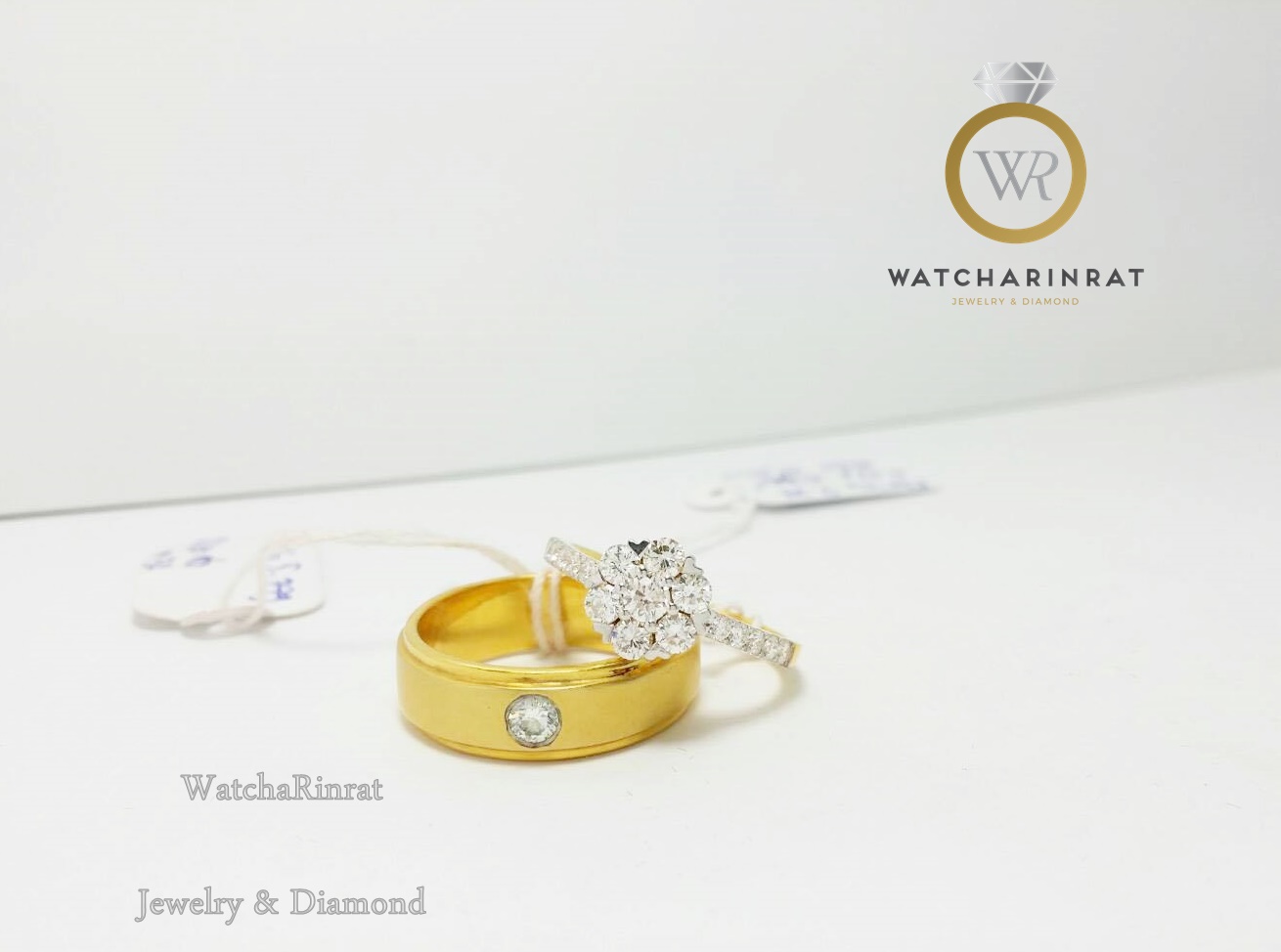 แหวนชาย/ แหวนพูนทรัพย์ 9K หนัก 5.39 กรัม/ เพชรแท้ 10 ตัง/ แหวนหญิง ทองคำแท้ 18K หนัก 1.83 กรัม/ เพชรแท้ 8 ตังเพิ่มเติม
