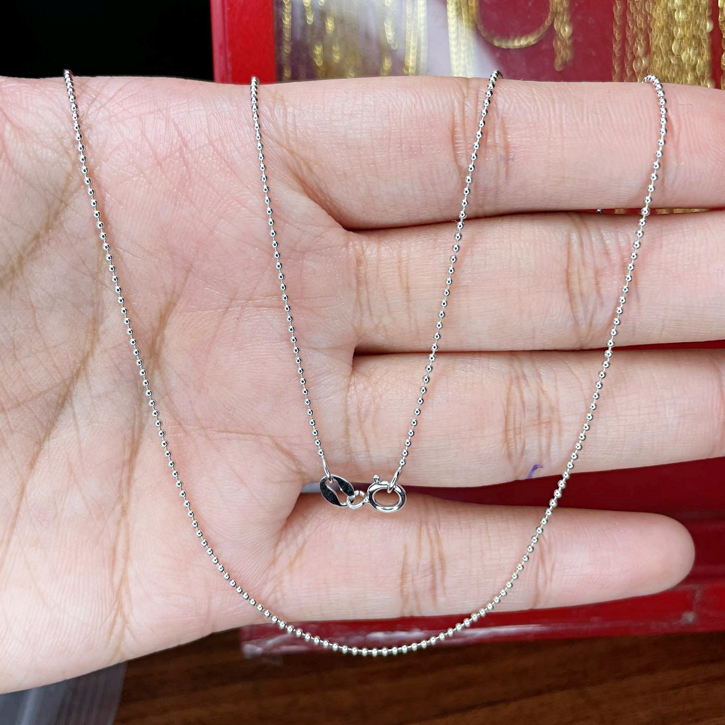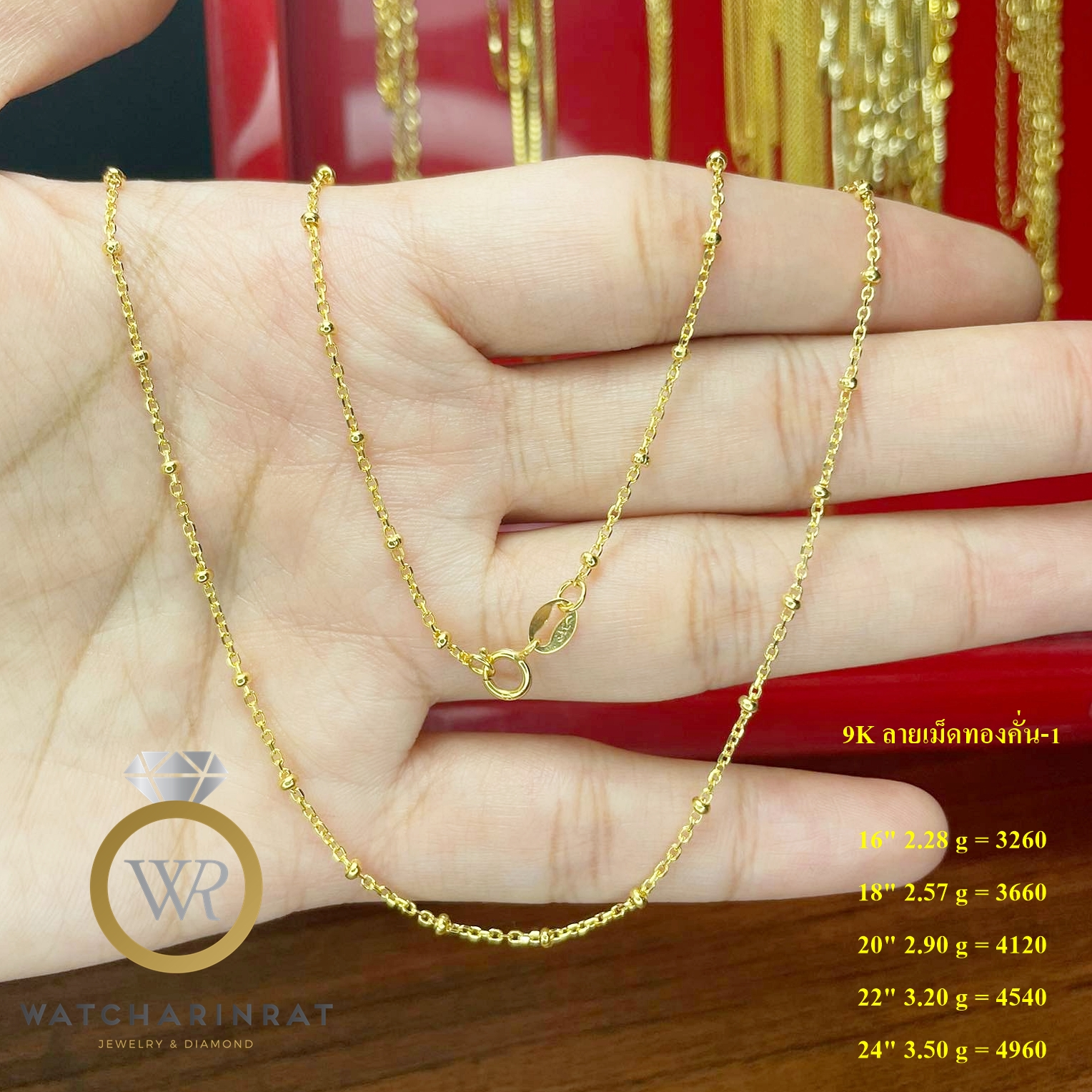 9K ลายเม็ดทองคั่น-1 16" 2.28 g = 3260 18" 2.57 g = 3660 20" 2.90 g = 4120 22" 3.20 g = 4540 24" 3.50 g = 4960เพิ่มเติม