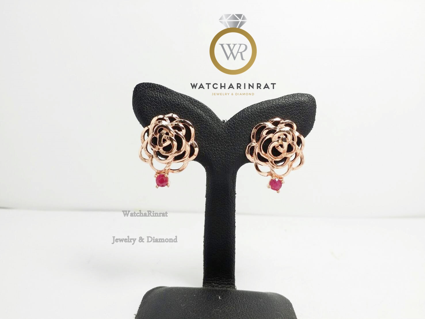 ตุ้มหูดอกไม้ สวยน่ารักเรียบหรู / ทองคำแท้พิ้งโกลว์ 18K หนัก 4.4 กรัม/ ประดับพลอยทับทิมแท้ 2 เม็ดเพิ่มเติม