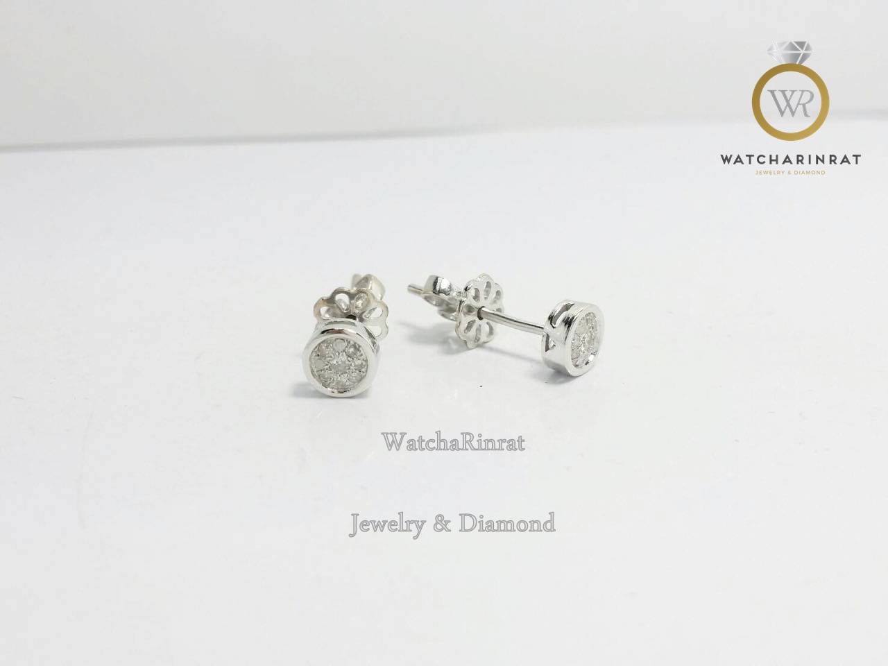 ตุ้มหูสวยหวาน น่ารัก มองคล้ายเพชรเม็ดใหญ่ /ตุ้มหูทองคำขาว 9K หนัก 1.34 กรัม/ ประดับเพชรแท้ เหลี่ยมกุหลาบ 18 เม็ด หนัก 0.1 กะรัต / แป้นลายดอกไม้ น่ารักทั้งด้านหน้า-ด้านหลังเพิ่มเติม