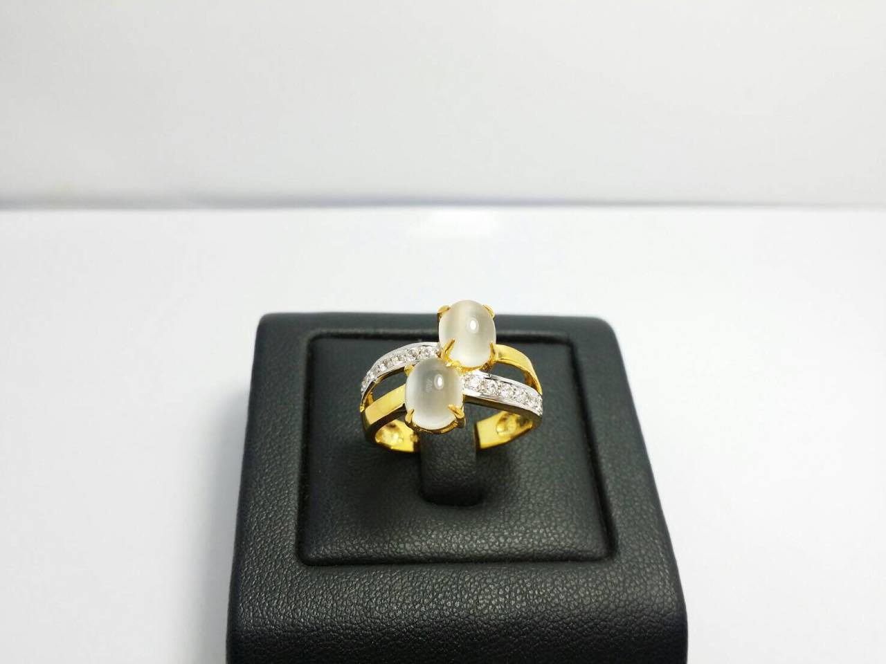 แหวนทองคำแท้ 9K 3.29 กรัม / ประดับพลอยมูนสโตนแท้ หินแห่งความรัก สัญลักษณ์แห่งความรุ่งเรืองและผาสุข / คั่นด้วยเพชรสวิสต์เกรดเอ ขาววิ้ง / ไซร์แหวนสามารถสั่งทำได้ค่ะเพิ่มเติม