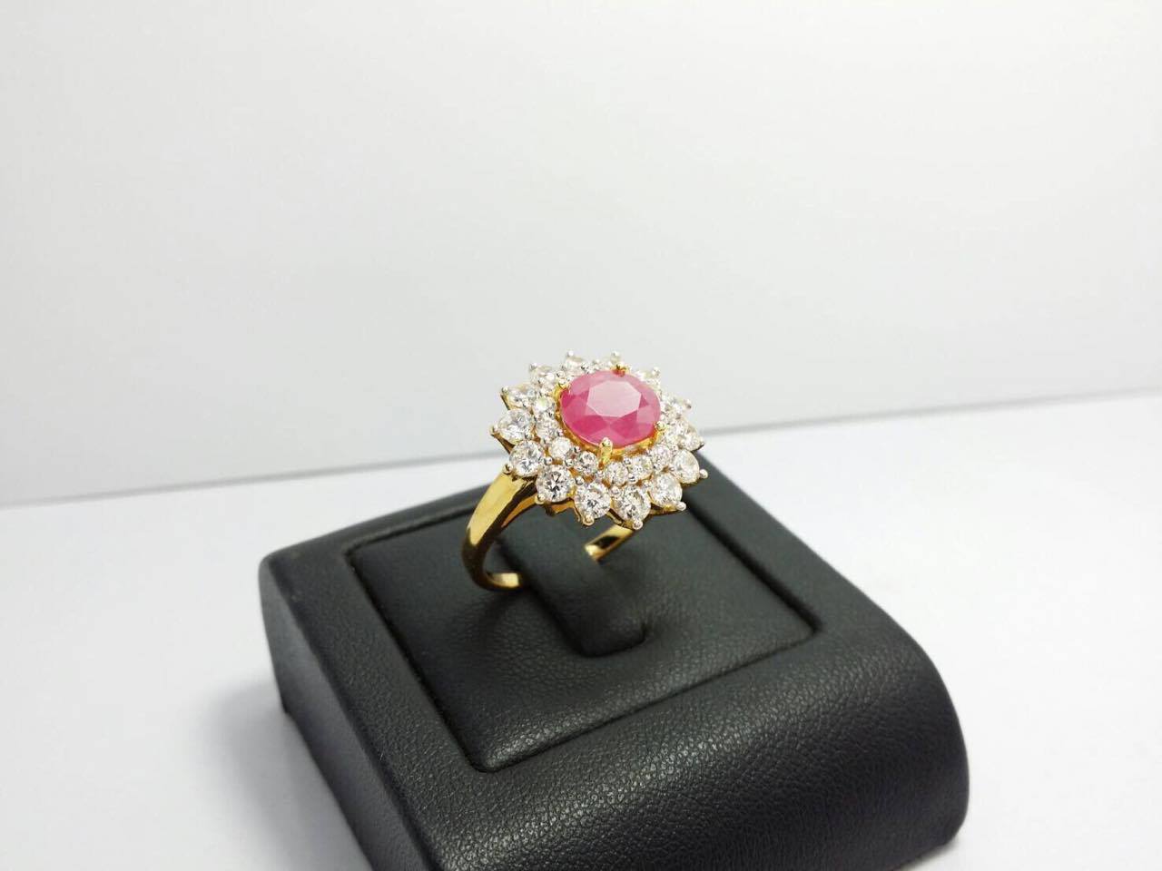 แหวนทองคำแท้ 18K หนัก 2 สลึง / ยอดประดับพลอยทับทิมแท้ สีชมพูสวยหวาน เชื่อกันว่าช่วยให้ผู้สวมใส่รุ่งเรือง และเป็นที่รักใคร่/ ล้อมด้วยเพชรสวิสต์เกรดเอ สวยวิ้ง / แบบหรูหราอลังการใส่เต็มนิ้วสุดๆเพิ่มเติม