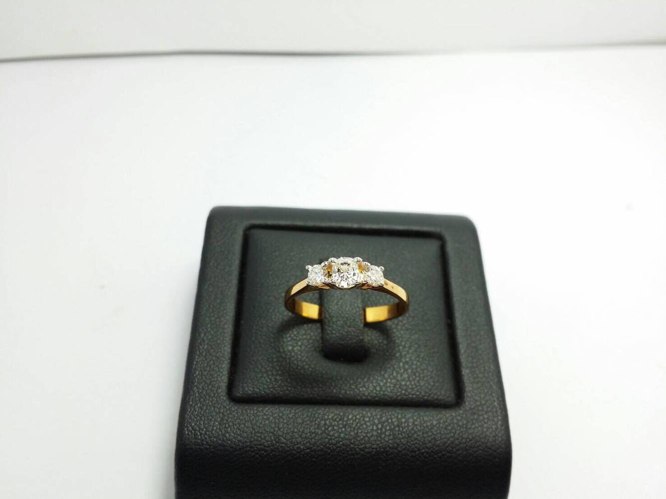 แหวนทองคำแท้ 18K หนัก 2.1 กรัม / เพชรกลาง เหลี่ยมคูชั่น หนัก 0.35 กะรัต / เพชรข้าง 2 เม็ด รวม 0.20 กะรัตเพิ่มเติม