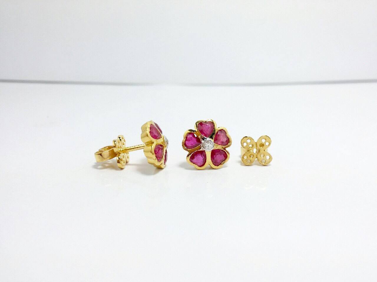 ตุ้มหูทองคำแท้ 90% น้ำหนัก 8.24 กรัม ประดับทับทิมแท้ ทรงหัวใจ จากพม่า 10 เม็ด เพชรกลางดอก 2 เม็ด น้ำ 98 0.06 กะรัต แป้นออกแบบพิเศษ สวยงามไม่ซ้ำใครเพิ่มเติม