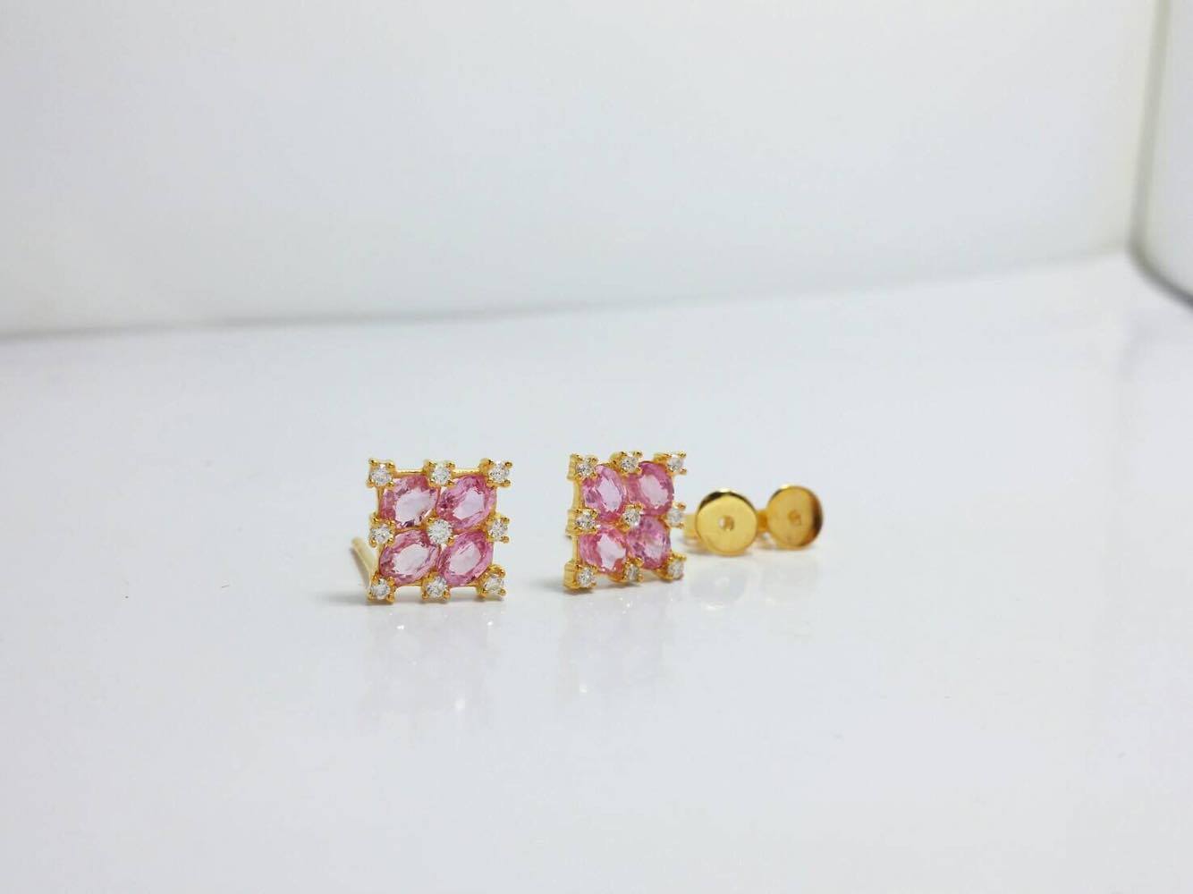 ตุ้มสวยหรู สีหวานน่ารัก ตัวเรือนทำจากทองคำแท้ 18K น้ำหนัก 2.5 กรัม ประดับพลอยชมพูแท้ 8 เม็ด น้ำหนัก 4 กะรัต และเพชรแท้ เหลี่ยมเบลเยี่ยม น้ำ 98 จำนวน 18 เม็ดเพิ่มเติม