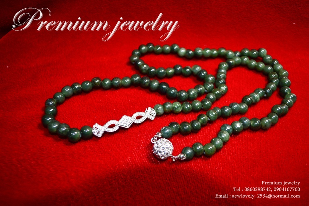 สร้อยหินกลีนการ์เนต สีเขียวทึบแสง ลายสวยมาก ประดับด้วยเงินแท้ หุ้มทองคำขาว และเพชรสวิสเกรดเอ สวยหรูมเพิ่มเติม
