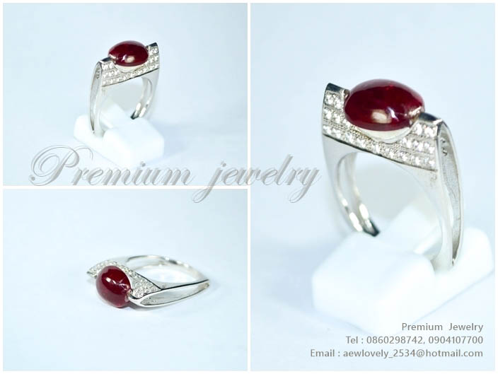 แหวนทองคำขาว ตัวเรือนด้านในทำจากเงินแท้ ประดับด้วยพลอยแท้สีเลือดหมู เจียระนัยทรงหลังเบี้ย ด้านข้างปรเพิ่มเติม