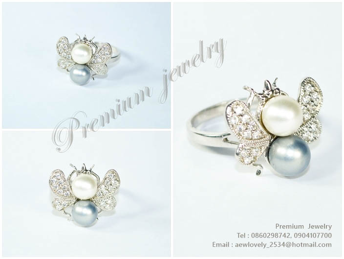 แหวนทองคำขาว ตัวเรือนด้านในทำจากเงินแท้ ทรงแมลงน่ารัก ประดับด้วยมุขน้ำจืดแท้สีขาวและสีเทา ด้านข้างปรเพิ่มเติม