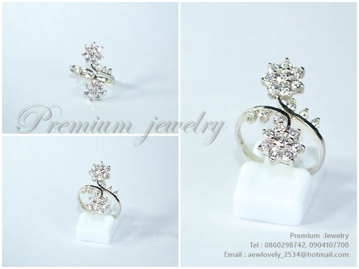 แหวนทองคำขาว ตัวเรือนด้านในทำจากเงินแท้ ทรงดอกไม้คู่ สวยหรู ประดับด้วยเพชรสวิสเกรดเอ แบบนี้ขายดีมากคเพิ่มเติม