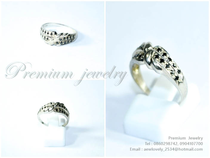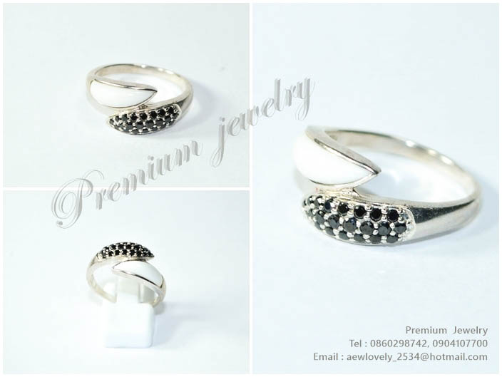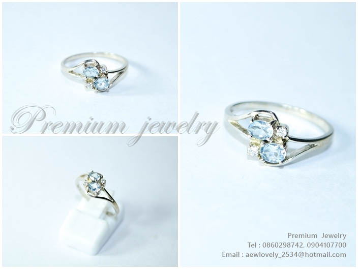 แหวนทองคำขาว ตัวเรือนด้านในทำจากเงินแท้ ประดับด้วยเทอควอยว์สีขาวบริสุทธ์ พร้อมทั้งนิลแท้จากเมืองกาญนเพิ่มเติม