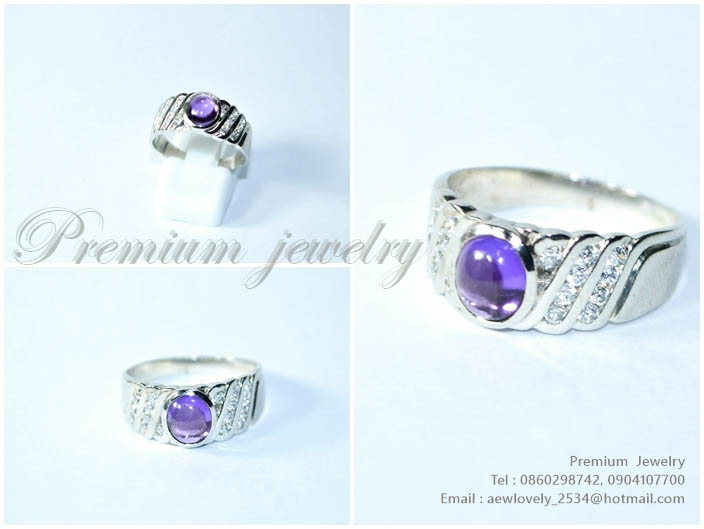 แหวนทองคำขาว ตัวเรือนด้านในทำจากเงินแท้ เม็ดยอดประดับด้วยพลอยแท้สีม่วง ด้านข้างประดับด้วยเพชรสวิสเกรเพิ่มเติม