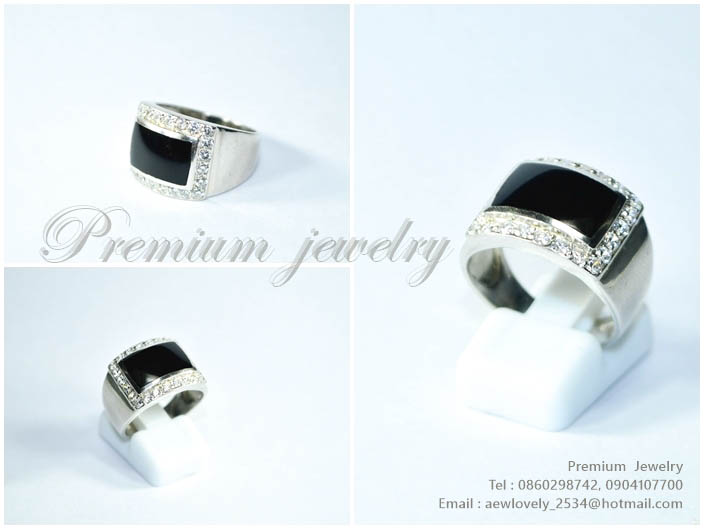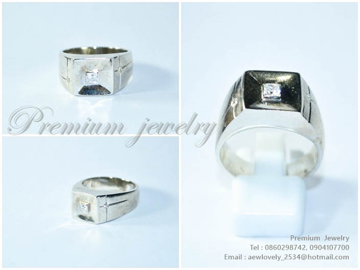 แหวนทองคำขาว ตัวเรือนด้านในทำจากเงินแท้ ทรงสี่เหลี่ยมแบบเรียบหรู ทรงแบบผู้ชาย ประดับด้วยเพชรสวิสเกรดเพิ่มเติม