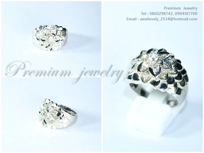 แหวนทองคำขาว ตัวเรือนด้านในทำจากเงินแท้ ทรงดอกไม้ ประดับด้วยเพชรสวิสเกรดเอ เพิ่มเติม