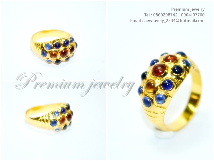 แหวนทอง 18K ตัวเรือนด้านในทำจากเงิน ทรงนูนหลังเต่า ประดับด้วยพลอยไพลิน และพลอยโกเมนแท้ ใส่เสริมศิริมเพิ่มเติม