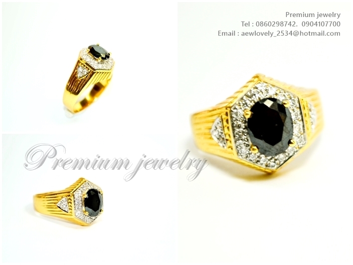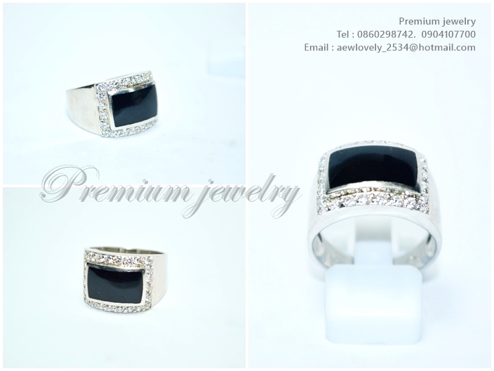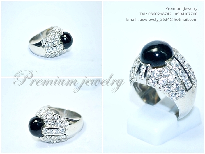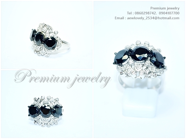แหวนทองคำขาว ตัวเรือนด้านในทำจากเงิน ประดับด้วยนิลแท้จากเมืองกาญน์ ล้อมรอบด้วยเพชรสวิสเกรดเอ ทรงนี้เเพิ่มเติม