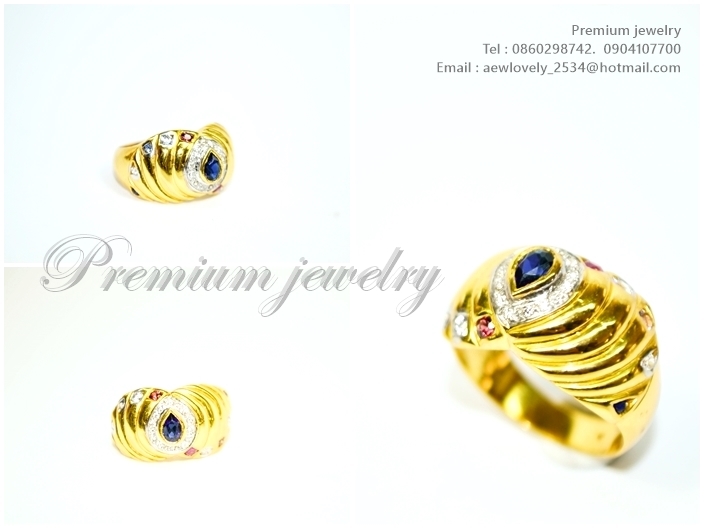 แหวนทอง 18K ตัวเรือนด้านในทำจากเงิน เม็ดยอดประดับด้วยไพลินแท้รูปหยดน้ำ ล้อมด้ยเพชรสวิสเกรดเอ ทรงนี้เเพิ่มเติม