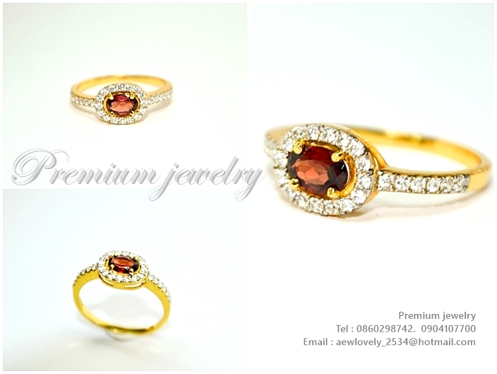 แหวนทอง 18K ตัวเรือนด้านในทำจากเงิน เม็ดยอดประดับด้วยพลอยโกเมนแท้ ล้อมด้วยเพชรสวิสเกรดเอ เพิ่มเติม