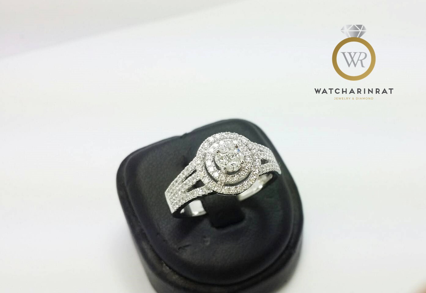 แหวนเพชรล้อมสวยหรู ดูอลังการ ใส่เต็มนิ้ว /ตัวเรือนทองคำขาว 18K หนัก 4.53 กรัม/เพชรแท้ 103 เม็ด 0.7 กะรัต น้ำ 98 เพิ่มเติม