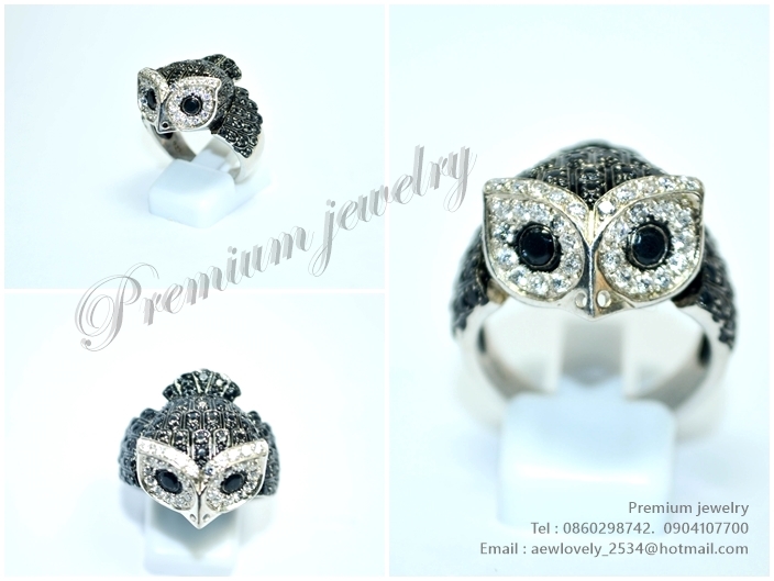 แหวนรูปนกฮูก ใส่เพื่อนำโชค เสริมโชคลาภเงินทอง ตัวเรือนทำจากเงินชุบทองคำขาว ด้านหน้าฝังเพชรสวิส ตัวนเพิ่มเติม