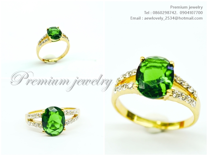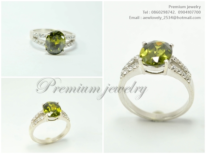 แหวนเงิน ชุปทองคำขาว ฝังพลอยแท้สีเขียวตองอ่อน ด้านข้างเป็นเพชรสวิวเกรดเอ เพิ่มเติม