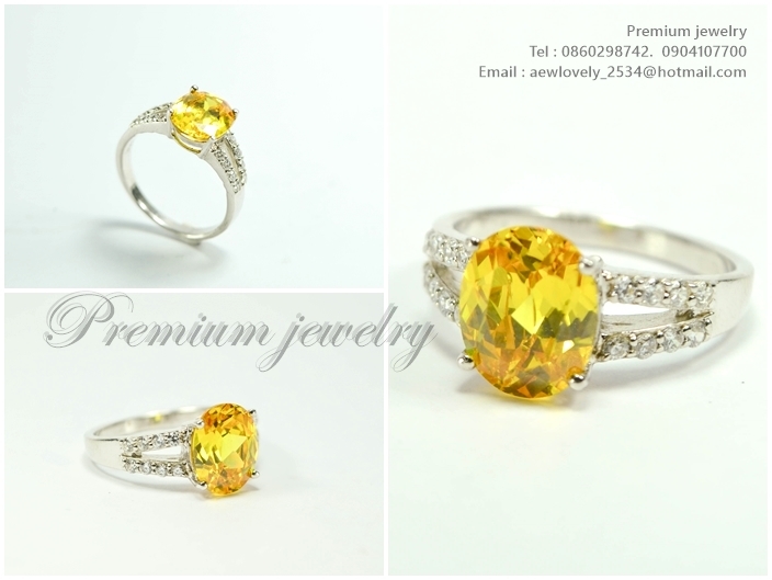 แหวนเงิน ชุบทองคำขาว เม็ดยอดฝังบุษราคัมพลอยแท้น้ำดี ด้านข้างฝังเพชรสวิสเกรดเอเพิ่มเติม