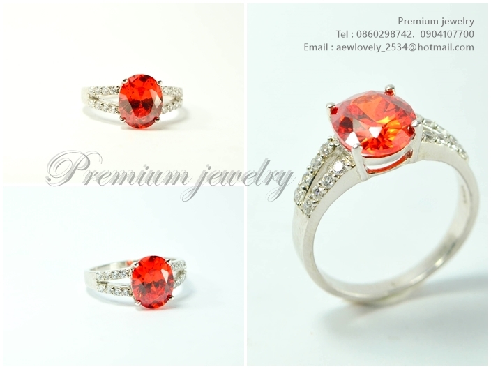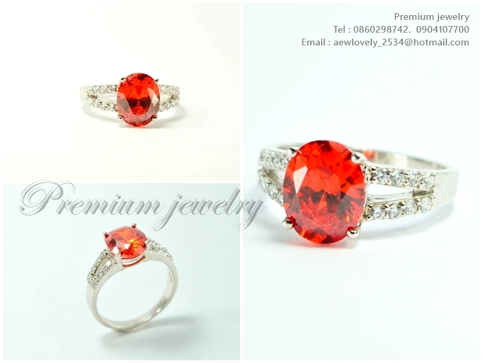 แหวนเงินชุบทองคำขาว เม็ดยอดฝังด้วยพลอแท้มีส้มน้ำดี ด้านข้างฝังเพชรสวิสเกรดเอเพิ่มเติม