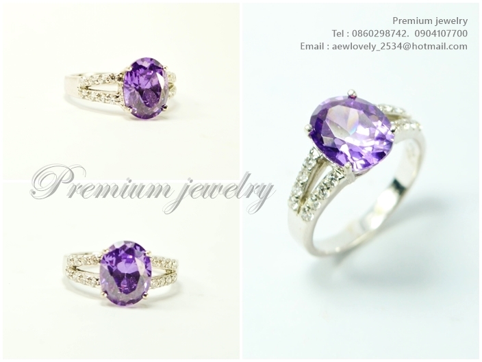 แหวนเงิน ชุบทองคำขาว เม็ดยอดฝังด้วยพลอยสีม่วงหรืออะมีทิสน้ำดี ด้านข้างฝังเพชรสวิสเกรดเอ เพิ่มเติม