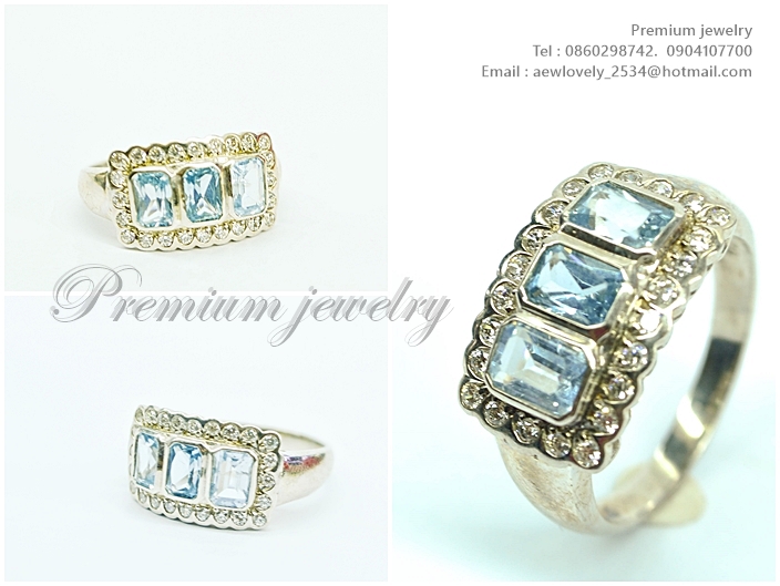 แหวนเงิน ชุบทองคำขาว ประดับด้วยพลอยสีฟ้าอ่อนสดใส น้ำสวย ทรงสี่เหลี่ยม ล้อมด้วยเพชรสวิสเกรดเอ เป็นแบบเพิ่มเติม