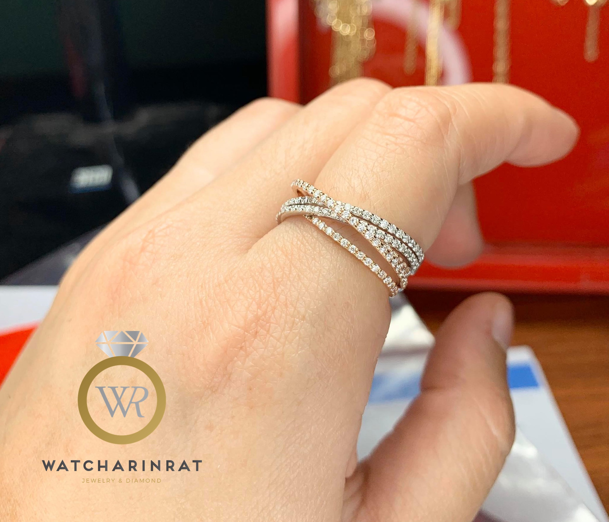 แหวนเพชรประกบ (หน้ากว้างเท่าเพชร 1 กะรัต) ตัวเรือน : ทองคำขาว 18K. 2.46 กรัม เพชรแท้ : 5 เม็ด 0.46 กะรัต น้ำ 97-98 ไซด์แหวน : 55 เพิ่มเติม