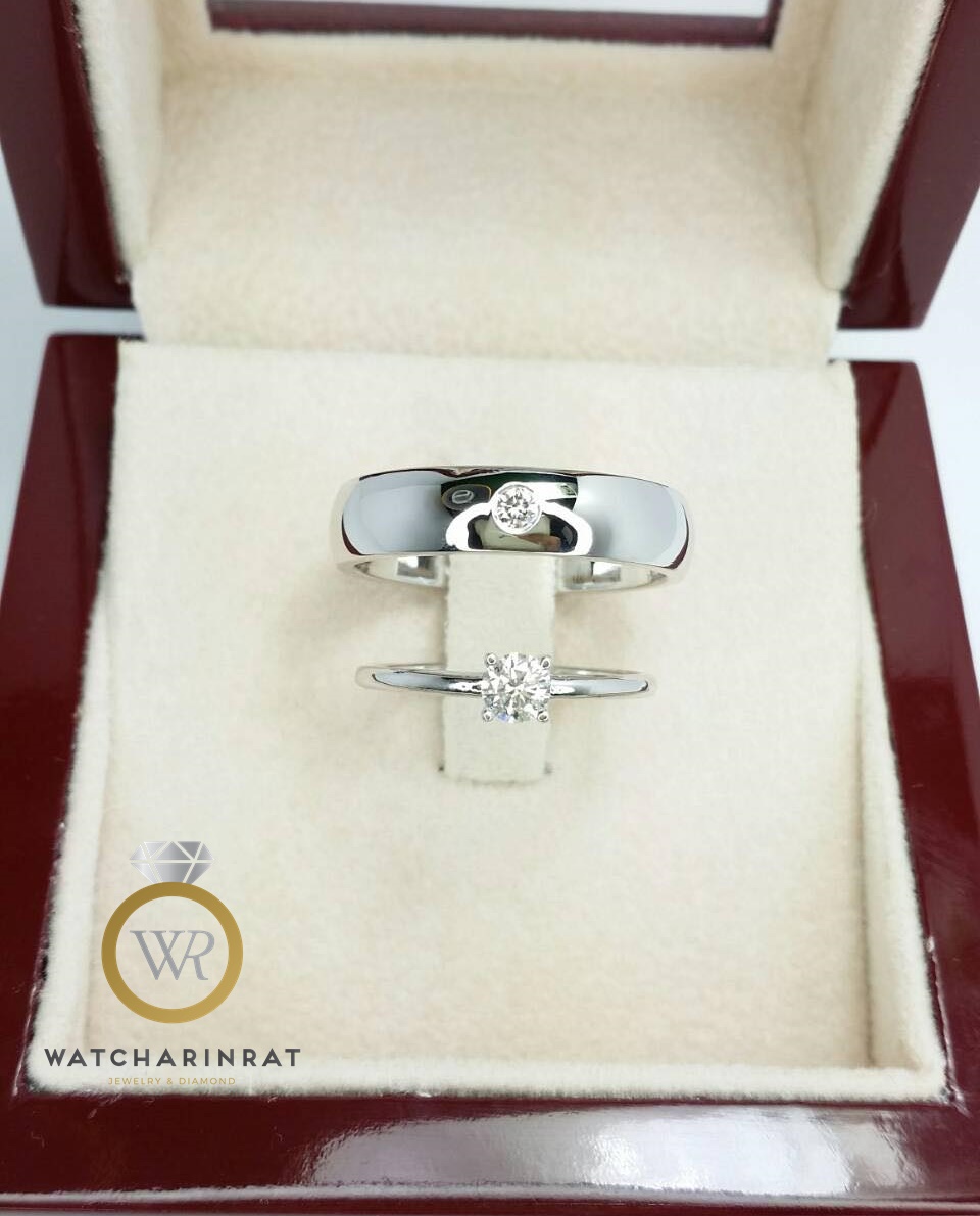 แหวนหมั้น แหวนแต่งงาน สไตล์เรียบหรู / แหวนชาย / ทองคำขาว 18K หนัก 7.23 กรัม / เพชรแท้ 1 เม็ด 0.05 กะรัต / แหวนหญิง / ทองคำขาว 18K 1.44 กรัม / เพชรแท้ 1 เม็ด 0.2 กะรัต เพิ่มเติม