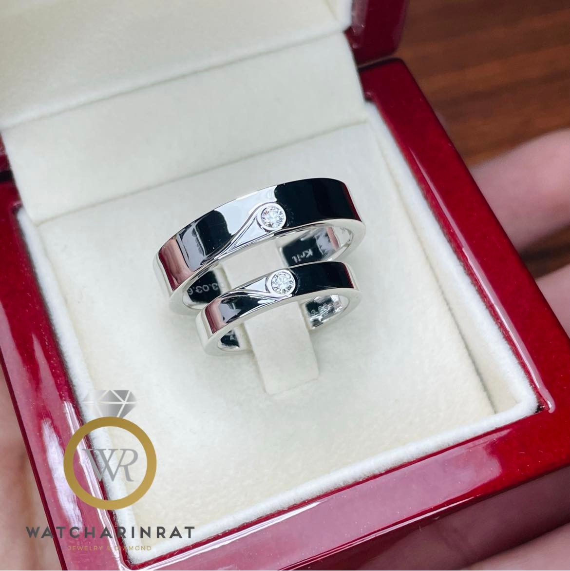 แหวนคู่ แหวนแต่งงาน แหวนหมั้น แหวนเพชรเม็ดเดียว สไตล์เรียบหรู ใส่ติดนิ้วได้ทุกวัน ออกแบบพิเศษให้ประกบกันเป็นรูปหัวใจได้ / ตัวเรือนทองคำขาว 9K หนัก 6.9 กรัม เพชรแท้ 2 เม็ด 0.10 กะรัต เพิ่มเติม
