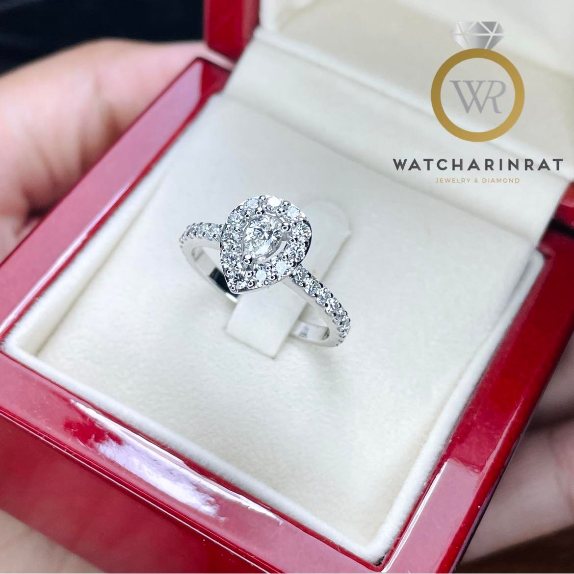 แหวนทรงหยดน้ำ สวยหวาน น่ารัก / ตัวเรือนทองคำขาว 18K หนัก 4 กรัม / เพชรแท้ 30 เม็ด 0.89 กะรัต (เพชรยอด 20 ตัง) เพิ่มเติม